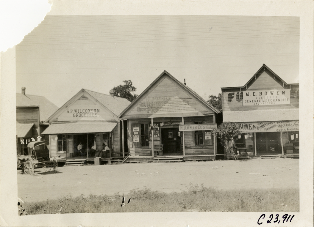 View of three wooden-frame rural stores during the 1910 Glidden Tour. Stores include S.P. Wilcoxson, groceries, shoe store and M.E. Bowen, dealer in general merchandise and produce. Stamped on back: "Spooner & Wells, Inc., photographers, telephone North 1745. 1231 Woodward Ave., Detroit, Mich. Detroit, 1231 Woodward, New York, 1931 Broadway." Handwritten on back: "Tours--Glidden Tour, 1910."