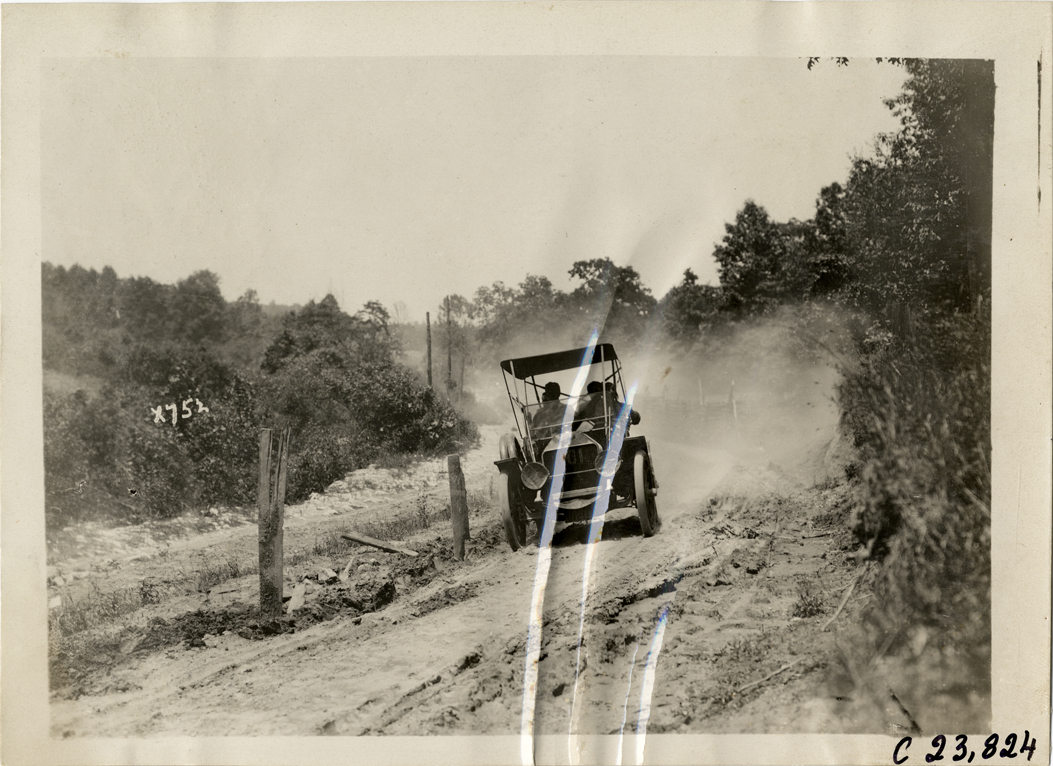 View of motorists in Moline car no. 101 traveling on rural dirt road during the 1910 Glidden Tour. Handwritten on back: "Tours--Glidden Tour, 1910."