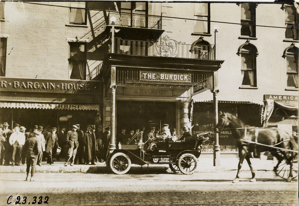 View of motorists in E-M-F car in front of the Burdick Hotel at Kalamazoo, Michigan during the pathfinding expedition for the 1909 Glidden Tour. Group of spectators stand on sidewalk. Handwritten on back: "Tours--Glidden Tour Pathfinder, 1909."
