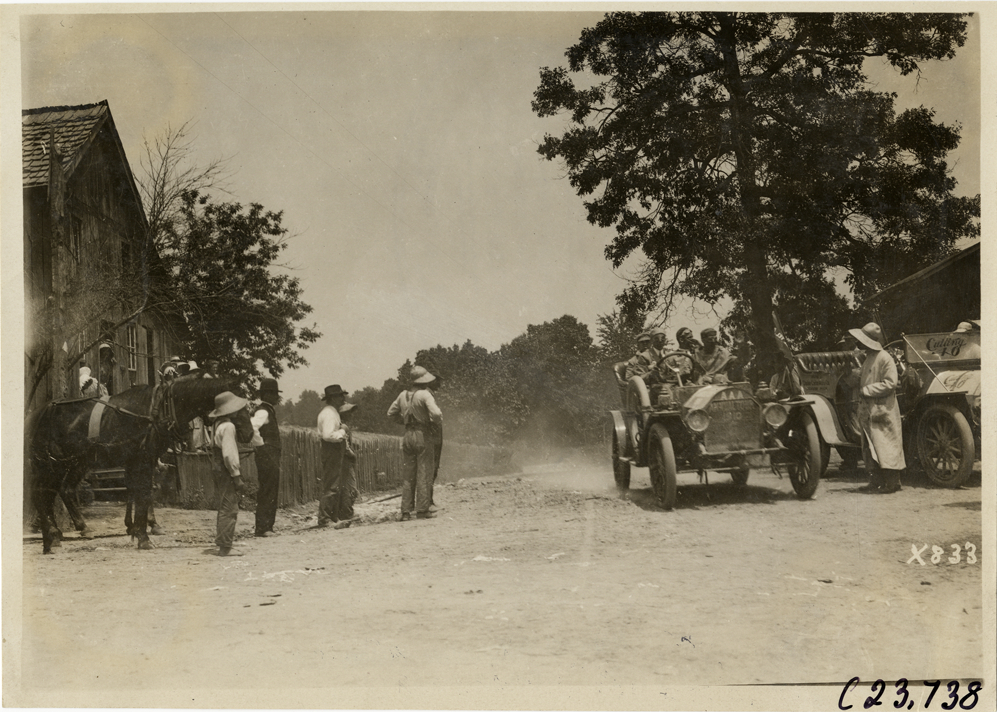 View of motorists with Cole car no. 6 and Cutting "40" car stopping on rural dirt road during the 1910 Glidden Tour. Spectators with horse in front of wooden-frame building on left. Stamped on back: "Spooner & Wells, Inc., photographers, telephone North 1745. 1231 Woodward Ave., Detroit, Mich. Detroit, 1231 Woodward, New York, 1931 Broadway." Handwritten on back: "Tours--Glidden Tour, 1910."