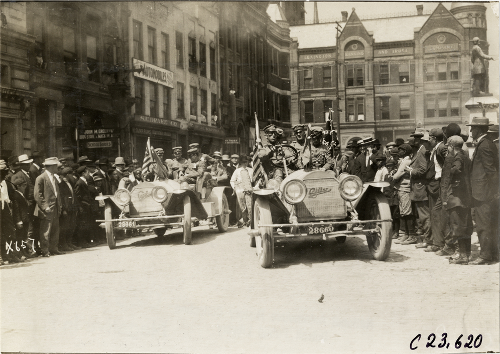 View of motorists in two Cadillac cars, surrounded by spectators, during the 1910 Glidden Tour. Lexington Banking and Trust Company building in background. Stamped on back: "Spooner & Wells, Inc., photographers, telephone North 1745. 1231 Woodward Ave., Detroit, Mich. Detroit, 1231 Woodward, New York, 1931 Broadway." Handwritten on back: "Tours--Glidden Tour, 1910."