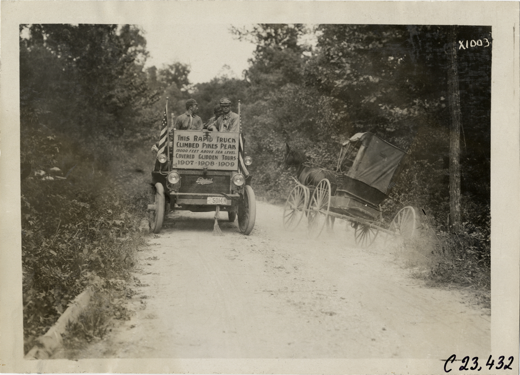 View of motorists with Rapid truck passing a horse-drawn carriage on dirt road during the 1910 Glidden Tour. Sign on truck reads: "This Rapid truck climbed Pikes Peak, 15,000 feet above sea level covered Glidden Tours 1907, 1908, 1909." Handwritten on back: "Tours--Glidden Tour, 1910."