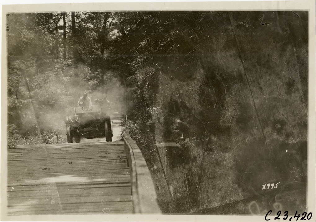 View of motorists in a Cutting "40" car crossing a wooden bridge during the 1910 Glidden Tour. Handwritten on back: "Tours--Glidden Tour, 1910."