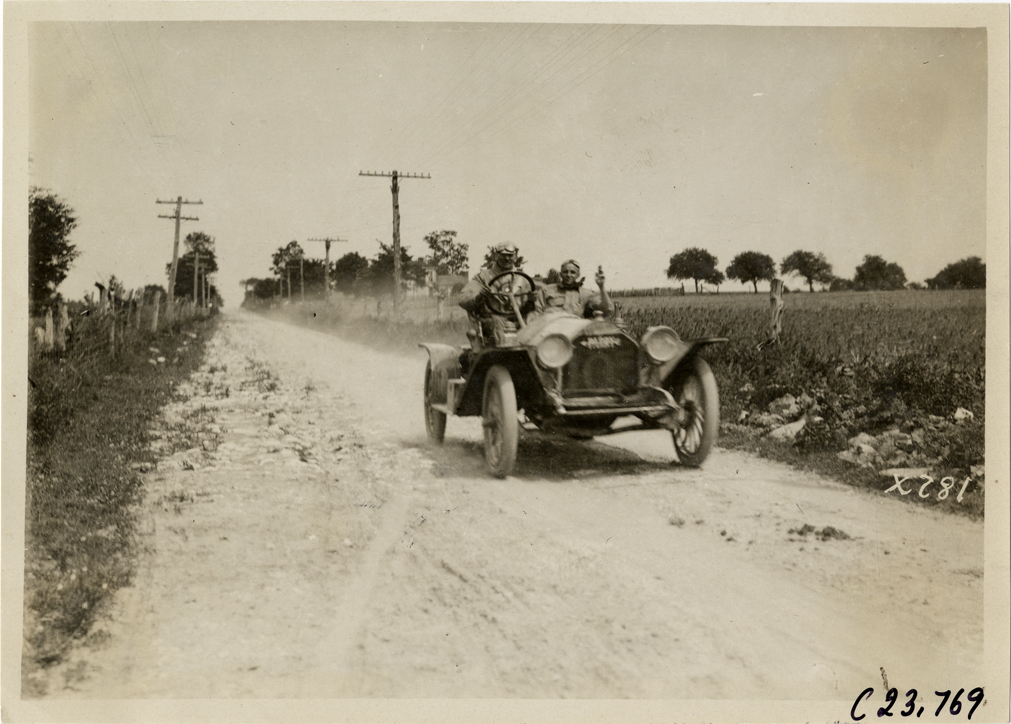View of motorists in Parry car no. 105 traveling on rural dirt road during the 1910 Glidden Tour. Stamped on back: "Spooner & Wells, Inc., photographers, telephone North 1745. 1231 Woodward Ave., Detroit, Mich. Detroit, 1231 Woodward, New York, 1931 Broadway." Handwritten on back: "Tours--Glidden Tour, 1910."