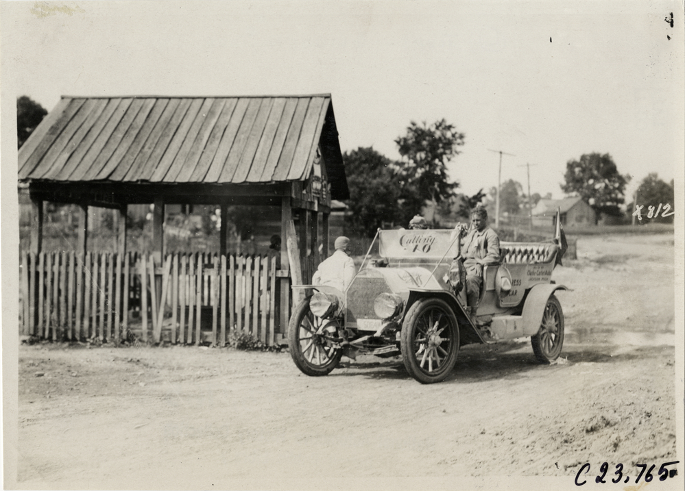 Motorists in Cutting automobile stopping on rural road, 1910 Glidden Tour