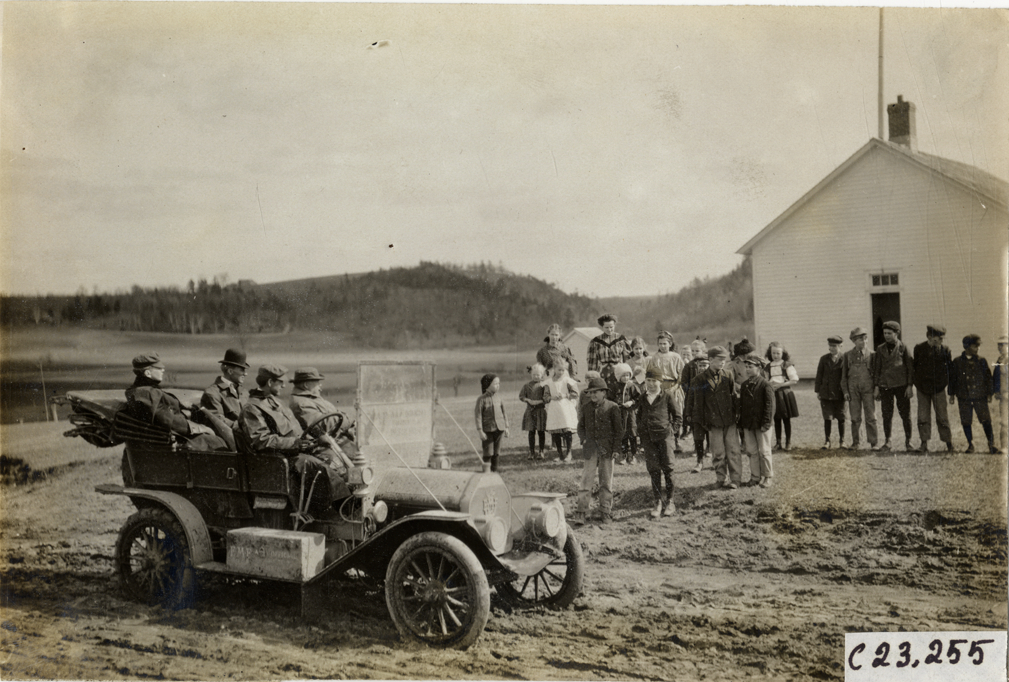 Motorists in E-M-F automobile greeting schoolchildren in front of schoolhouse, 1909 Glidden pathfinding expedition