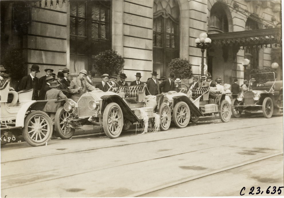 View of spectators looking at row of cars parked next to curb during the 1910 Glidden Tour. Stone building, possibly a hotel, in background. Stamped on back: "Spooner & Wells, Inc., photographers, telephone North 1745. 1231 Woodward Ave., Detroit, Mich. Detroit, 1231 Woodward, New York, 1931 Broadway." Handwritten on back: "Tours--Glidden Tour, 1910."