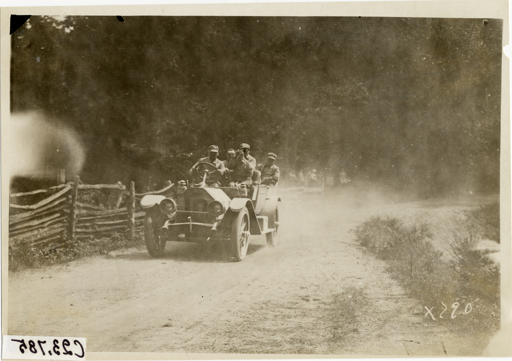 View of motorists in Glide car no. 10 traveling on rural dirt road during the 1910 Glidden Tour. Stamped on back: "Spooner & Wells, Inc., photographers, telephone North 1745. 1231 Woodward Ave., Detroit, Mich. Detroit, 1231 Woodward, New York, 1931 Broadway." Handwritten on back: "Tours--Glidden Tour, 1910."