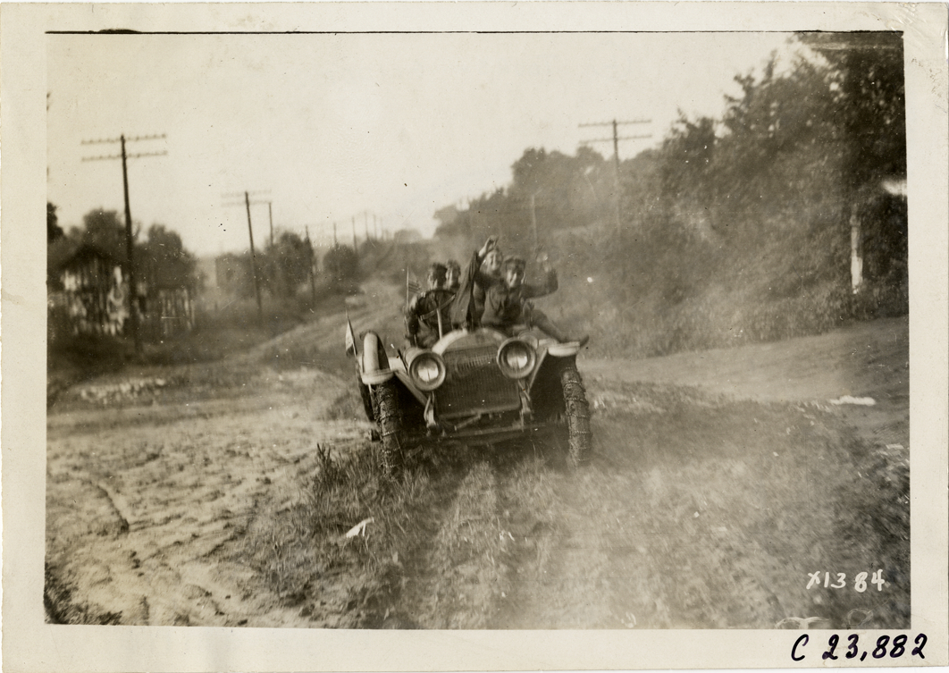 View of motorists in Cadillac car traveling on rural dirt road during the 1910 Glidden Tour. Passenger raises arms in greeting. Stamped on back: "Spooner & Wells, Inc., photographers, telephone North 1745. 1231 Woodward Ave., Detroit, Mich. Detroit, 1231 Woodward, New York, 1931 Broadway." Handwritten on back: "Tours--Glidden Tour, 1910."