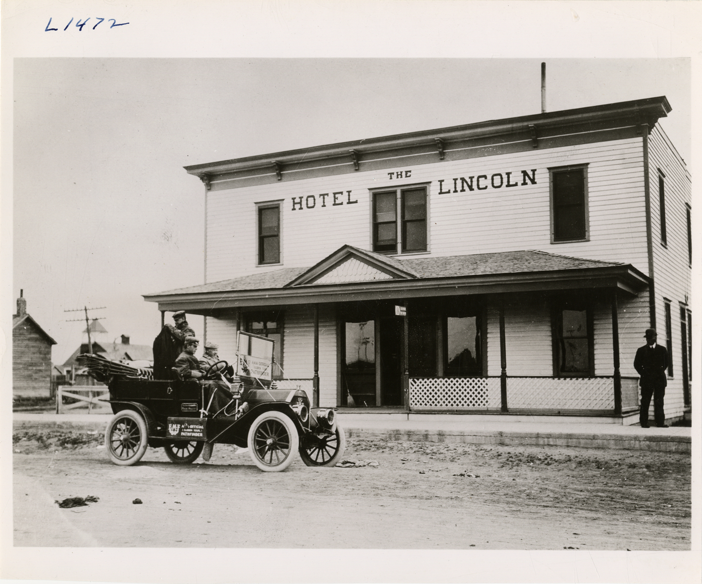 View of motorists in E-M-F car in front of the Hotel Lincoln during the pathfinding expedition for the 1909 Glidden Tour. Man stands in front of two-story wooden-frame building. Typed on back: "1909 Glidden Tour, Detroit to Denver, now for a full night's rest." Handwritten on back: "Tours--Glidden Tour Pathfinder, 1909."