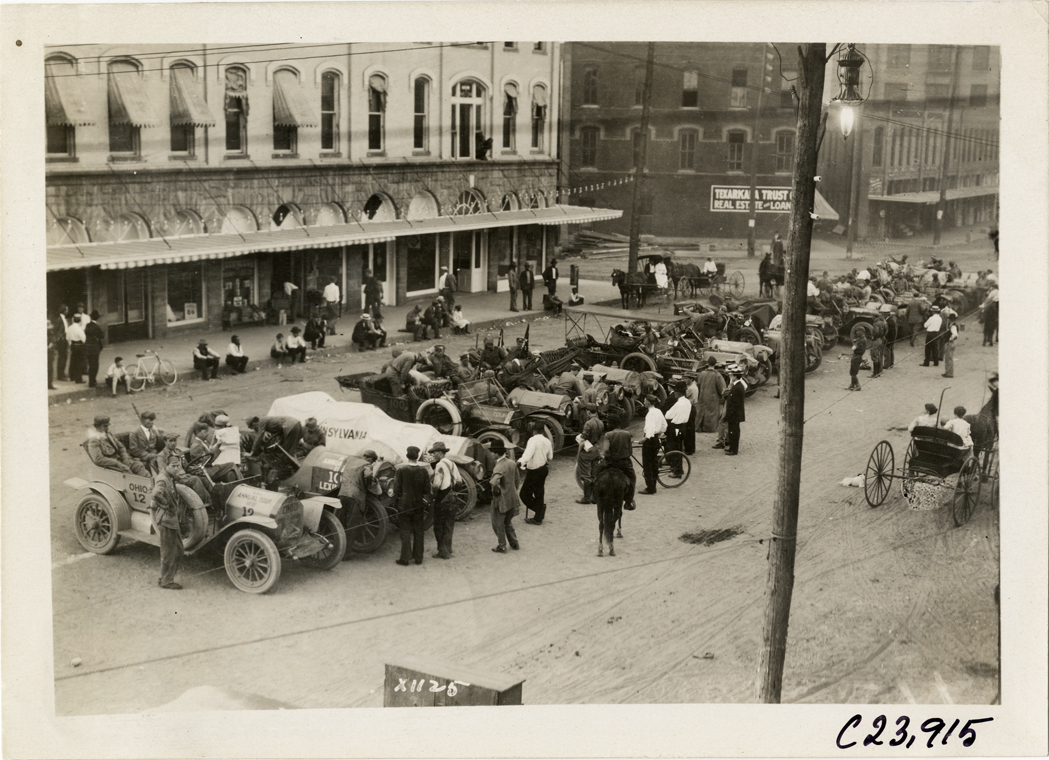 View of spectators looking at row of cars parked in street during the 1910 Glidden Tour. Commercial buildings in background. Stamped on back: "Spooner & Wells, Inc., photographers, telephone North 1745. 1231 Woodward Ave., Detroit, Mich. Detroit, 1231 Woodward, New York, 1931 Broadway." Handwritten on back: "Tours--Glidden Tour, 1910."