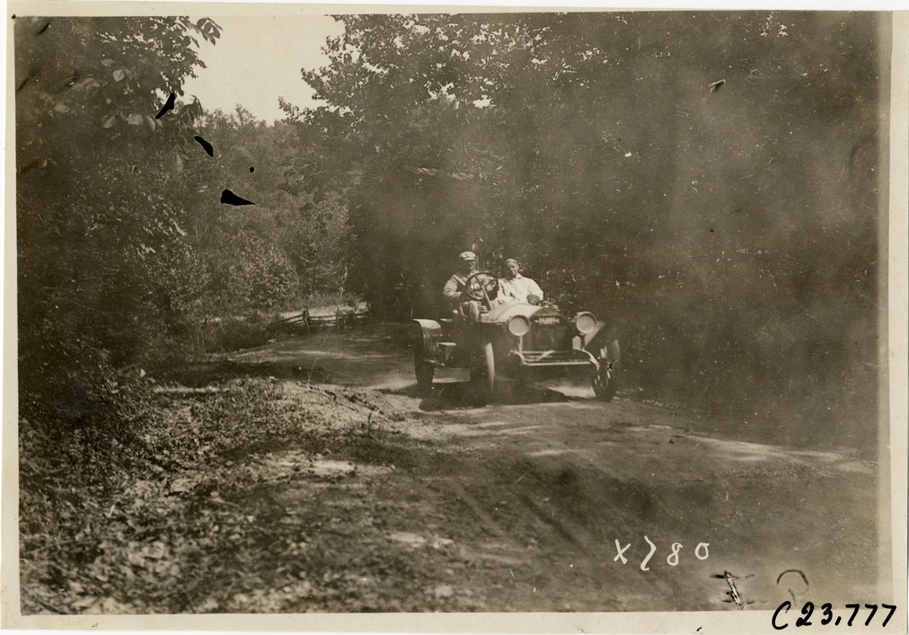 View of motorists in Parry car no. 107 traveling on rural dirt road during the 1910 Glidden Tour. Stamped on back: "Spooner & Wells, Inc., photographers, telephone North 1745. 1231 Woodward Ave., Detroit, Mich. Detroit, 1231 Woodward, New York, 1931 Broadway." Handwritten on back: "Tours--Glidden Tour, 1910."