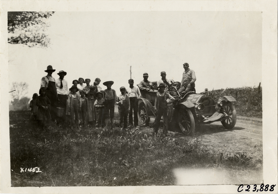 View of motorists and spectators posing with Chalmers car no. 3 on rural dirt road during the 1910 Glidden Tour. Stamped on back: "Spooner & Wells, Inc., photographers, telephone North 1745. 1231 Woodward Ave., Detroit, Mich. Detroit, 1231 Woodward, New York, 1931 Broadway." Handwritten on back: "Tours--Glidden Tour, 1910."