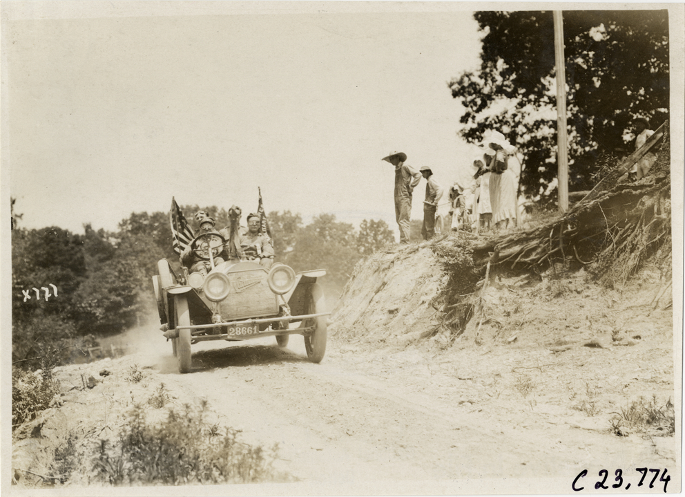 View of motorists in Cadillac car traveling on rural dirt road during the 1910 Glidden Tour. Spectators stand on roadside. Stamped on back: "Spooner & Wells, Inc., photographers, telephone North 1745. 1231 Woodward Ave., Detroit, Mich. Detroit, 1231 Woodward, New York, 1931 Broadway." Handwritten on back: "Tours--Glidden Tour, 1910."