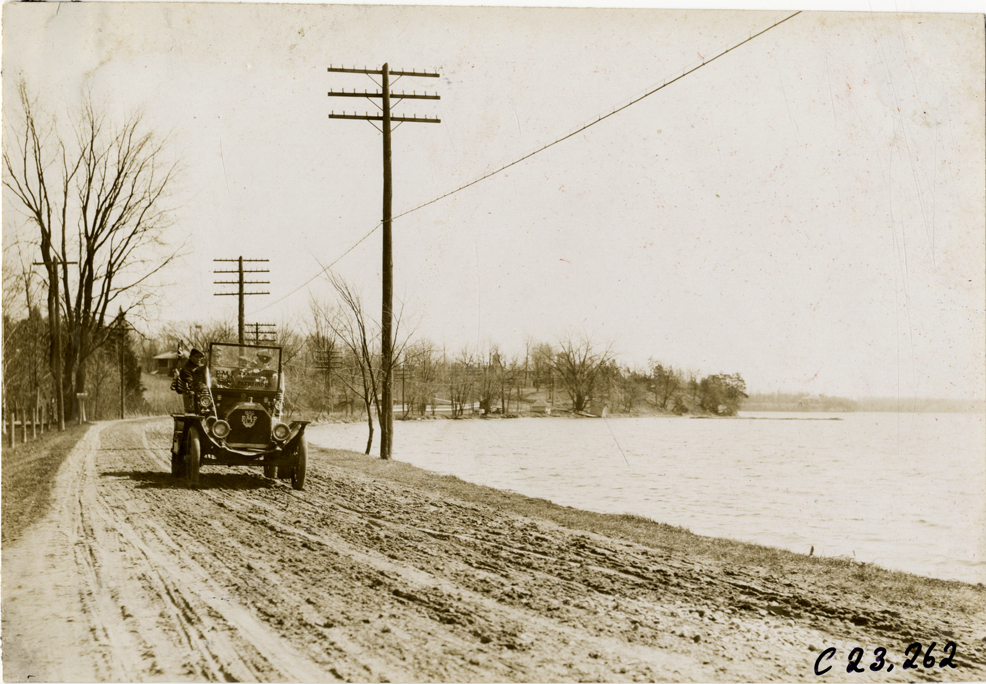 View of motorists in E-M-F car traveling on dirt road along lake during the pathfinding expedition for the 1909 Glidden Tour. Handwritten on back: "Tours--Glidden Tour Pathfinder, 1909."