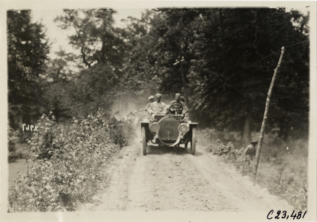 View of motorists in Chalmers car no. 5 traveling on rural dirt road during the 1910 Glidden Tour. Stamped on back: "Spooner & Wells, Inc., photographers, telephone North 1745. 1231 Woodward Ave., Detroit, Mich. Detroit, 1231 Woodward, New York, 1931 Broadway." Handwritten on back: "Tours--Glidden Tour, 1910."