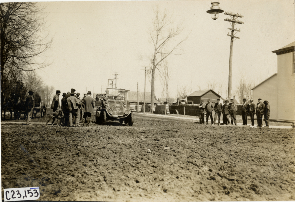 Distant view of spectators greeting motorists in E-M-F car on dirt road during the pathfinding expedition for the 1909 Glidden Tour. Handwritten on back: "Tours--Glidden Tour Pathfinder, 1909."