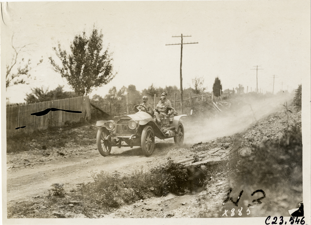 View of motorists in Lexington car no. 103 traveling on rural dirt road during the 1910 Glidden Tour. Stamped on back: "Spooner & Wells, Inc., photographers, telephone North 1745. 1231 Woodward Ave., Detroit, Mich. Detroit, 1231 Woodward, New York, 1931 Broadway." Handwritten on back: "Tours--Glidden Tour, 1910."