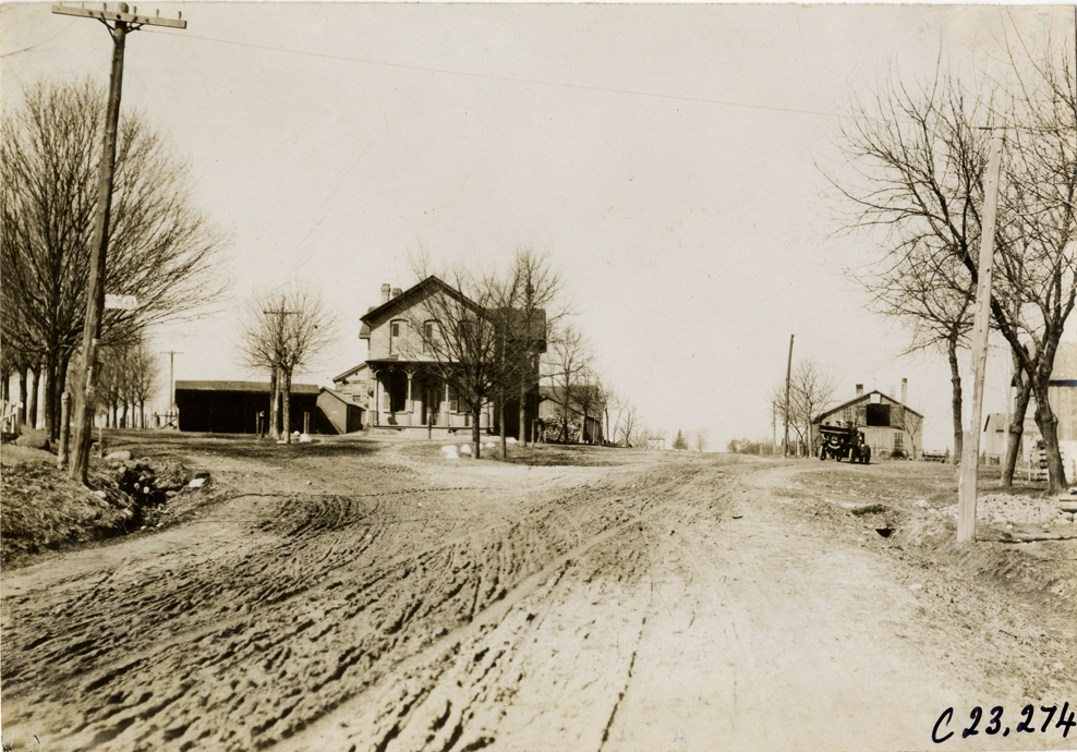 Rear view of motorists in E-M-F car traveling on rural dirt road during the pathfinding expedition for the 1909 Glidden Tour. Houses and barns in background. Handwritten on back: "Tours--Glidden Tour Pathfinder, 1909."