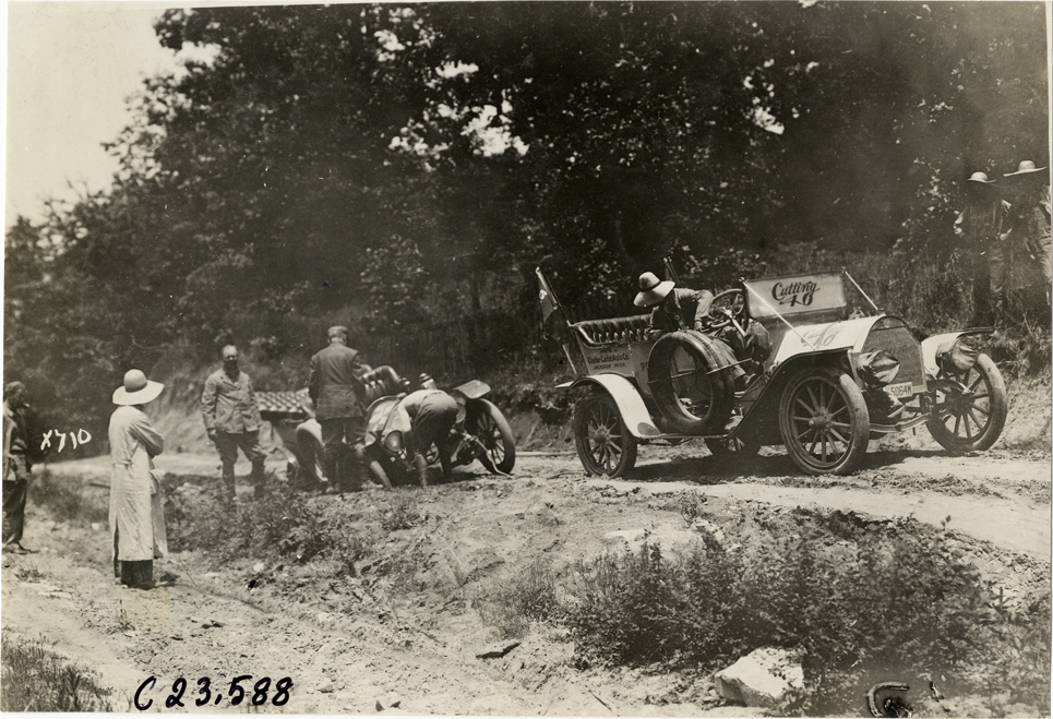View of motorists trying to dislodge car on sandy road during the 1910 Glidden Tour. Cutting "40" car on right. Stamped on back: "Spooner & Wells, Inc., photographers, telephone North 1745. 1231 Woodward Ave., Detroit, Mich. Detroit, 1231 Woodward, New York, 1931 Broadway." Handwritten on back: "Tours--Glidden Tour, 1910."