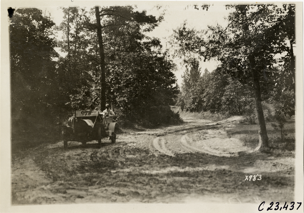 View of motorists in Cutting "40" car traveling on dirt road during the 1910 Glidden Tour. Stamped on back: "Spooner & Wells, Inc., photographers, telephone North 1745. 1231 Woodward Ave., Detroit, Mich. Detroit, 1231 Woodward, New York, 1931 Broadway." Handwritten on back: "Tours--Glidden Tour, 1910."