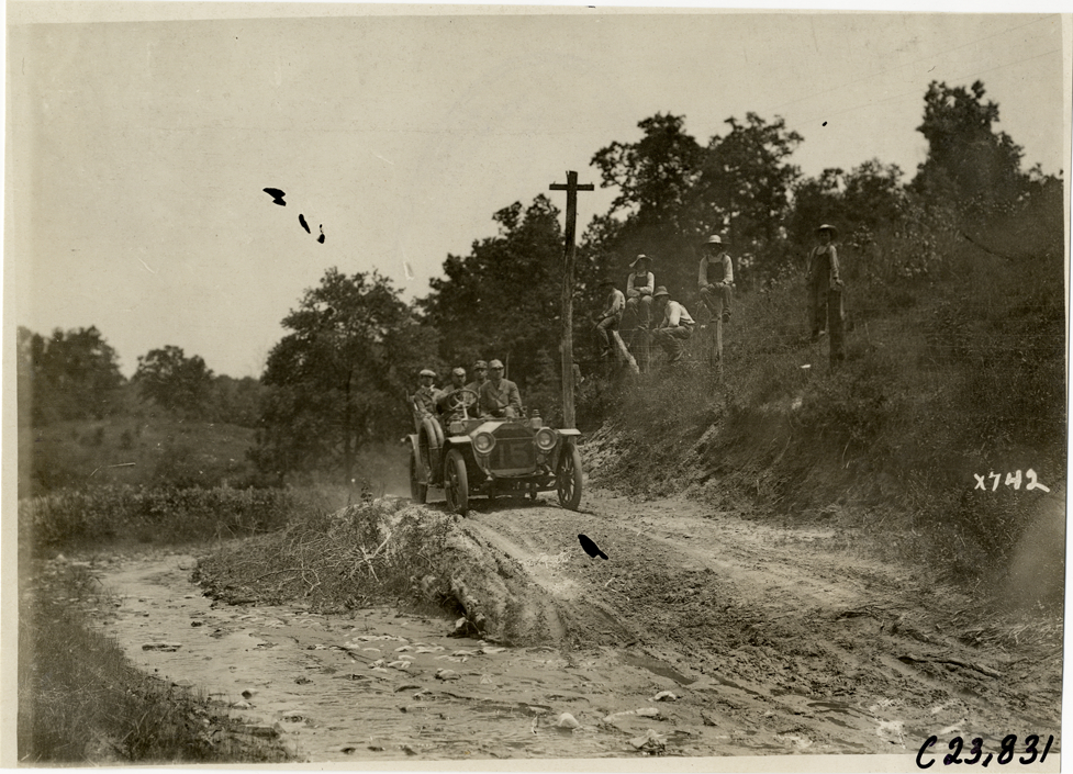 View of motorists in Cino car no. 15 traveling on rural dirt road during the 1910 Glidden Tour. Several men stand on roadside. Stamped on back: "Spooner & Wells, Inc., photographers, telephone North 1745. 1231 Woodward Ave., Detroit, Mich. Detroit, 1231 Woodward, New York, 1931 Broadway." Handwritten on back: "Tours--Glidden Tour, 1910."