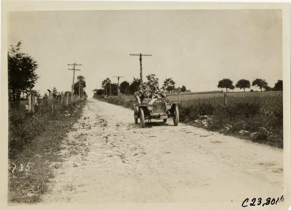 Motorists in Cole automobile traveling on rural road, 1910 Glidden Tour