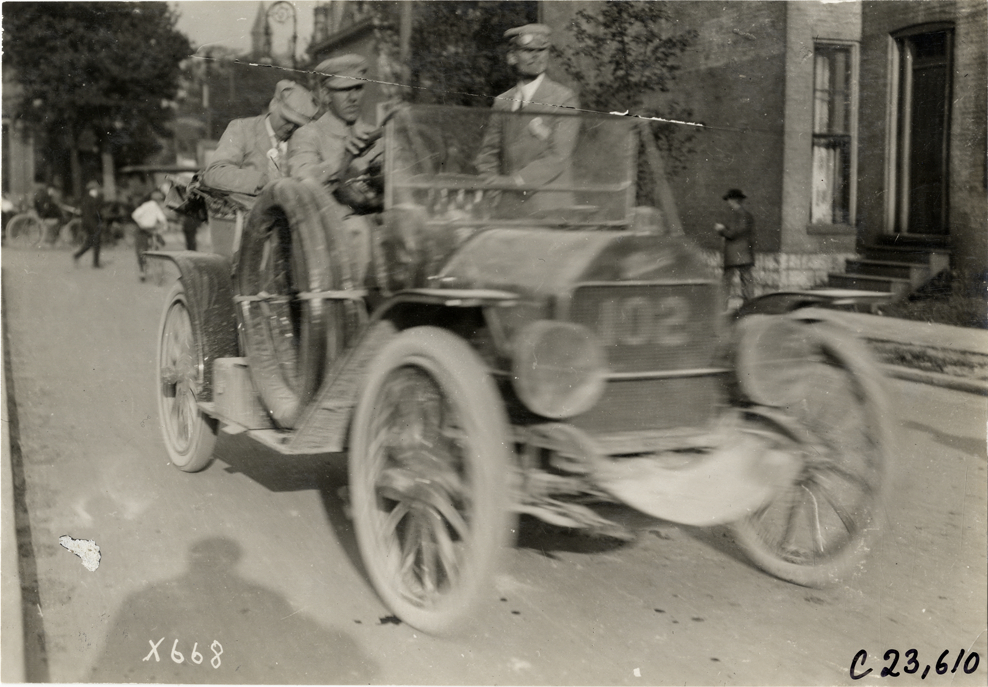 View of motorists in Moline car no. 102 during the 1910 Glidden Tour. Stamped on back: "Spooner & Wells, Inc., photographers, telephone North 1745. 1231 Woodward Ave., Detroit, Mich. Detroit, 1231 Woodward, New York, 1931 Broadway." Handwritten on back: "Tours--Glidden Tour, 1910."