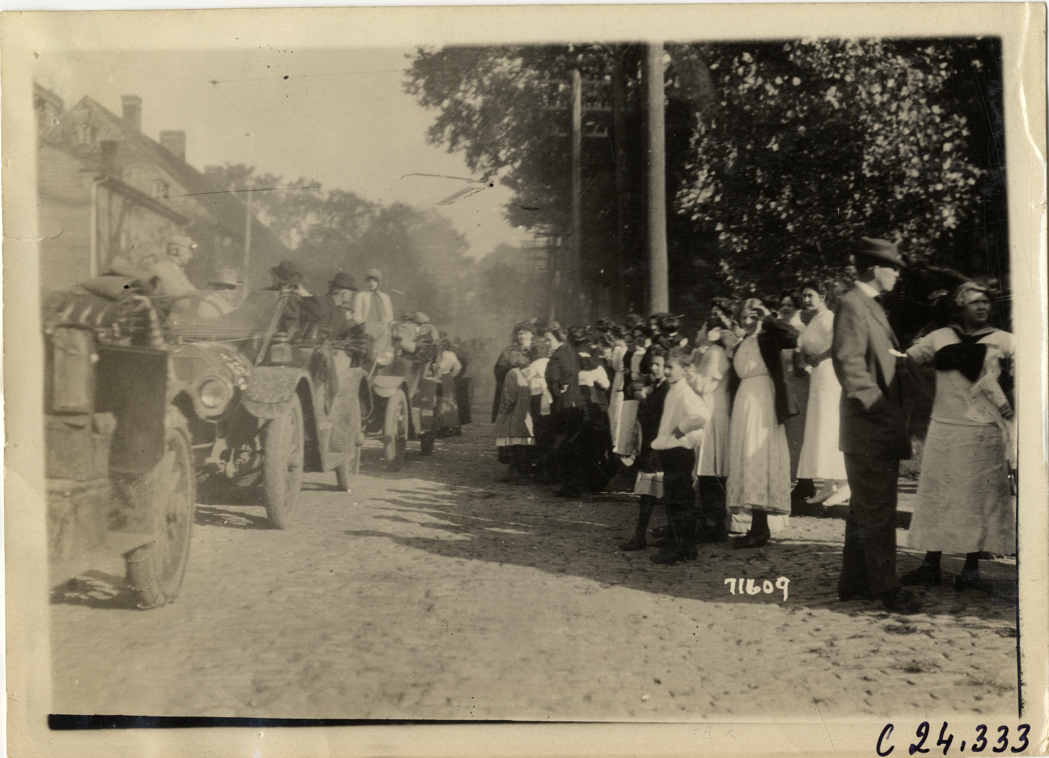 View of spectators watching cars lined up in road during the 1911 Glidden Tour. Handwritten on back: "Tours--Glidden Tour, 1911."