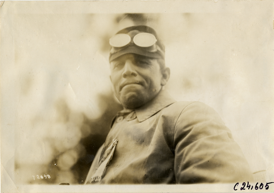 Close-up view of automobile driver during the 1911 Glidden Tour. Stamped on back: "Spooner & Wells, Inc., photographers, telephones 3472-3473 Columbus, 1931 Broadway, New York." Handwritten on back: "Tours--Glidden Tour, 1911."