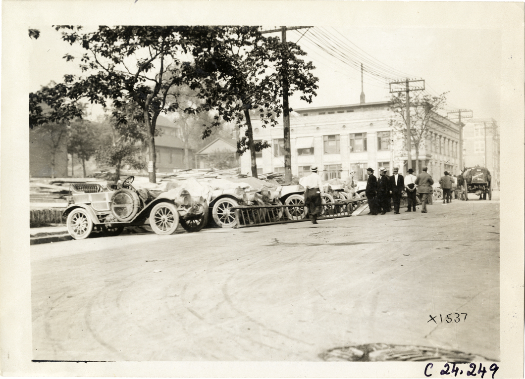 View of several spectators looking at row of cars parked in street during the 1910 Glidden Tour. Stamped on back: "Spooner & Wells, Inc., photographers, telephone North 1745. 1231 Woodward Ave., Detroit, Mich. Detroit, 1231 Woodward, New York, 1931 Broadway." Handwritten on back: "Tours--Glidden Tour, 1910."