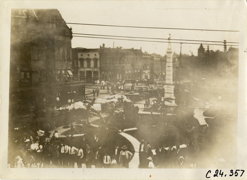 View of cars and spectators around Confederate monument at Anderson, South Carolina during the 1911 Glidden Tour. Commercial buildings in background. Stamped on back: "Spooner & Wells, Inc., photographers, telephones 3472-3473 Columbus, 1931 Broadway, New York." Handwritten on back: "Tours--Glidden Tour, 1911."