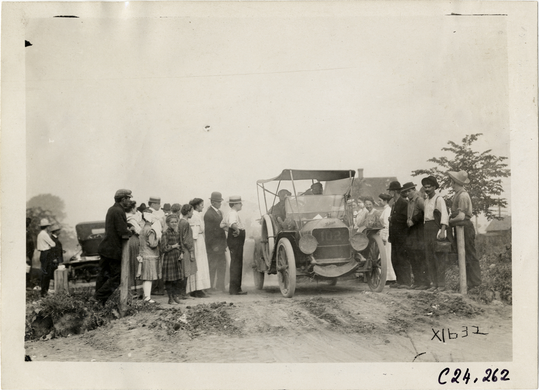 View of motorists in Moline car no. 102, surrounded by spectators, during the 1910 Glidden Tour. Stamped on back: "Spooner & Wells, Inc., photographers, telephone North 1745. 1231 Woodward Ave., Detroit, Mich. Detroit, 1231 Woodward, New York, 1931 Broadway." Handwritten on back: "Tours--Glidden Tour, 1910."