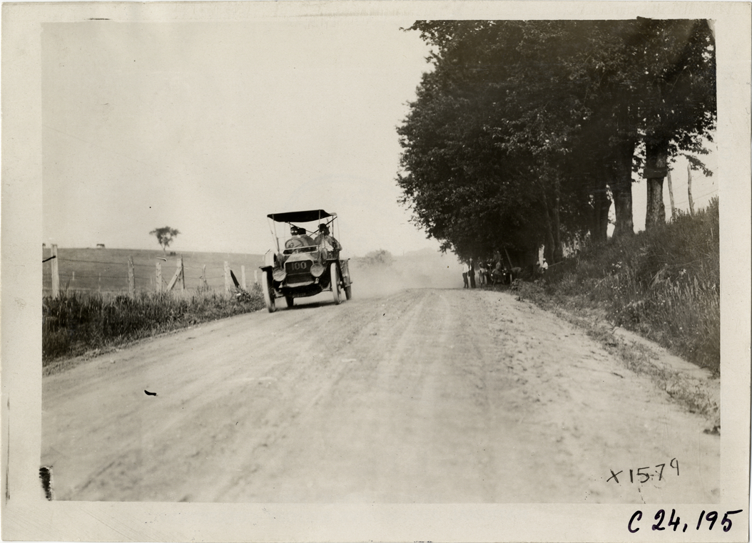 View of motorists in Moline car no. 100 traveling on rural dirt road during the 1910 Glidden Tour. Stamped on back: "Spooner & Wells, Inc., photographers, telephone North 1745. 1231 Woodward Ave., Detroit, Mich. Detroit, 1231 Woodward, New York, 1931 Broadway." Handwritten on back: "Tours--Glidden Tour, 1910."