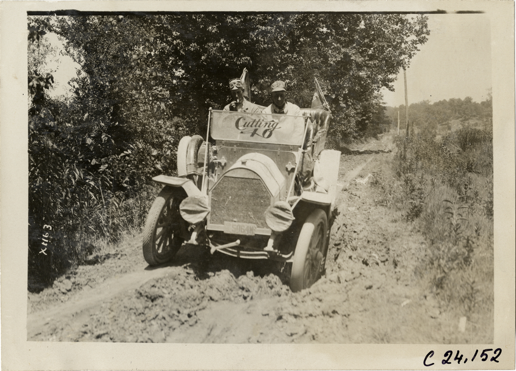 View of motorists in Cutting "40" car traveling on muddy rural road during the 1910 Glidden Tour. Handwritten on back: "Tours--Glidden Tour, 1910."