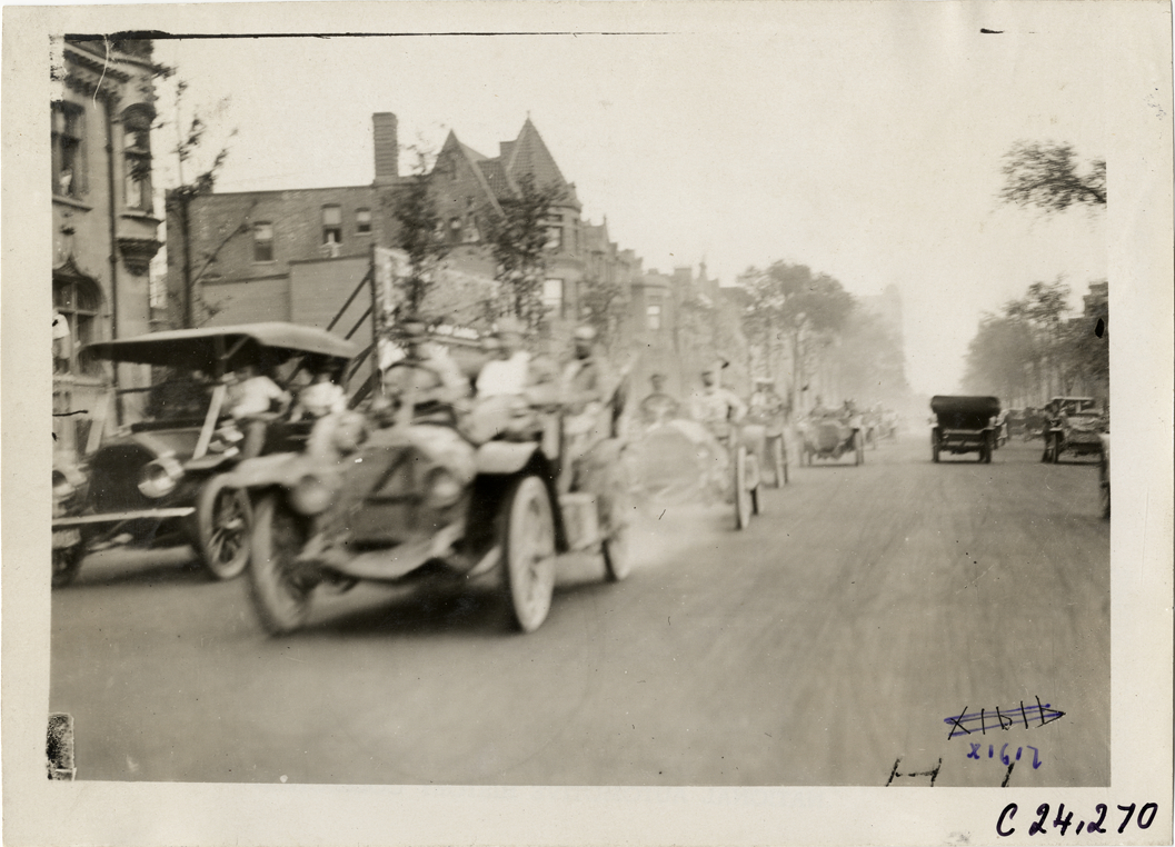 View of motorists in Chalmers car no. 4, followed closely by other cars, during the 1910 Glidden Tour. Billboards and residential buildings in background. Stamped on back: "Spooner & Wells, Inc., photographers, telephone North 1745. 1231 Woodward Ave., Detroit, Mich. Detroit, 1231 Woodward, New York, 1931 Broadway." Handwritten on back: "Tours--Glidden Tour, 1910."