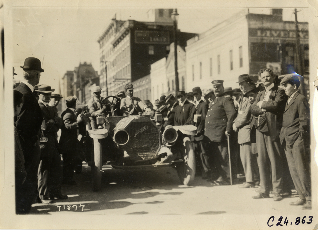 View of motorists in Mitchell car, surrounded by spectators and policeman, at Macon, Georgia during the 1911 Glidden Tour. Hotel Lanier and other commercial buildings in background. Stamped on back: "Spooner & Wells, Inc., photographers, telephones 3472-3473 Columbus, 1931 Broadway, New York." Handwritten on back: "Tours--Glidden Tour, 1911."