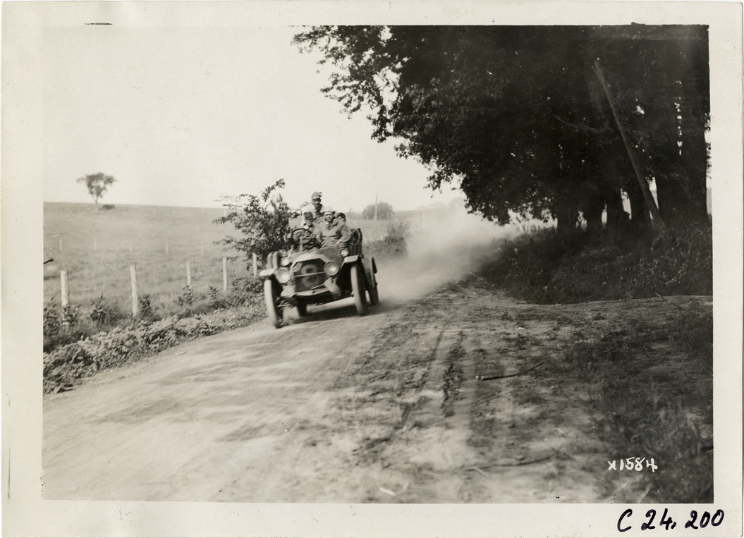 View of motorists in Cartercar no. 8 traveling on rural dirt road during the 1910 Glidden Tour. Stamped on back: "Spooner & Wells, Inc., photographers, telephone North 1745. 1231 Woodward Ave., Detroit, Mich. Detroit, 1231 Woodward, New York, 1931 Broadway." Handwritten on back: "Tours--Glidden Tour, 1910."