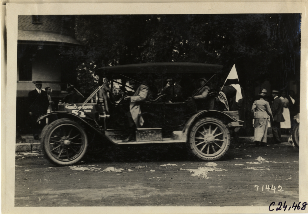 View of motorists in Cadillac car no. 51 during the 1911 Glidden Tour. Handwritten on back: "Tours--Glidden Tour, 1911."