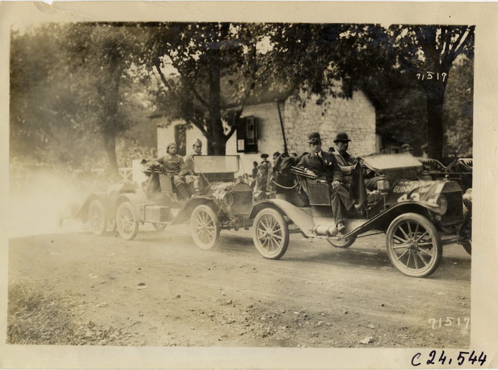View of motorists in Ford cars no. 43 and no. 44 during the 1911 Glidden Tour. Stone house in background. Stamped on back: "Spooner & Wells, Inc., photographers, telephones 3472-3473 Columbus, 1931 Broadway, New York." Handwritten on back: "Tours--Glidden Tour, 1911."