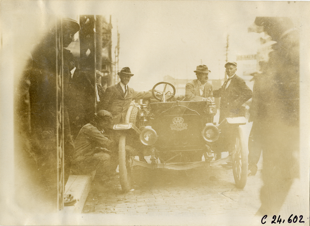 View of motorists in Flanders car during the 1911 Glidden Tour. Stamped on back: "Spooner & Wells, Inc., photographers, telephones 3472-3473 Columbus, 1931 Broadway, New York." Handwritten on back: "Tours--Glidden Tour, 1911."
