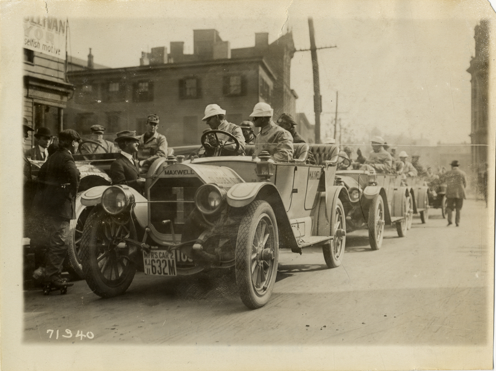 View of motorists in Maxwell car no. 1, followed closely by other cars, during the 1911 Glidden Tour. Stamped on back: "Spooner & Wells, Inc., photographers, telephones 3472-3473 Columbus, 1931 Broadway, New York." Handwritten on back: "Tours--Glidden Tour, 1911."