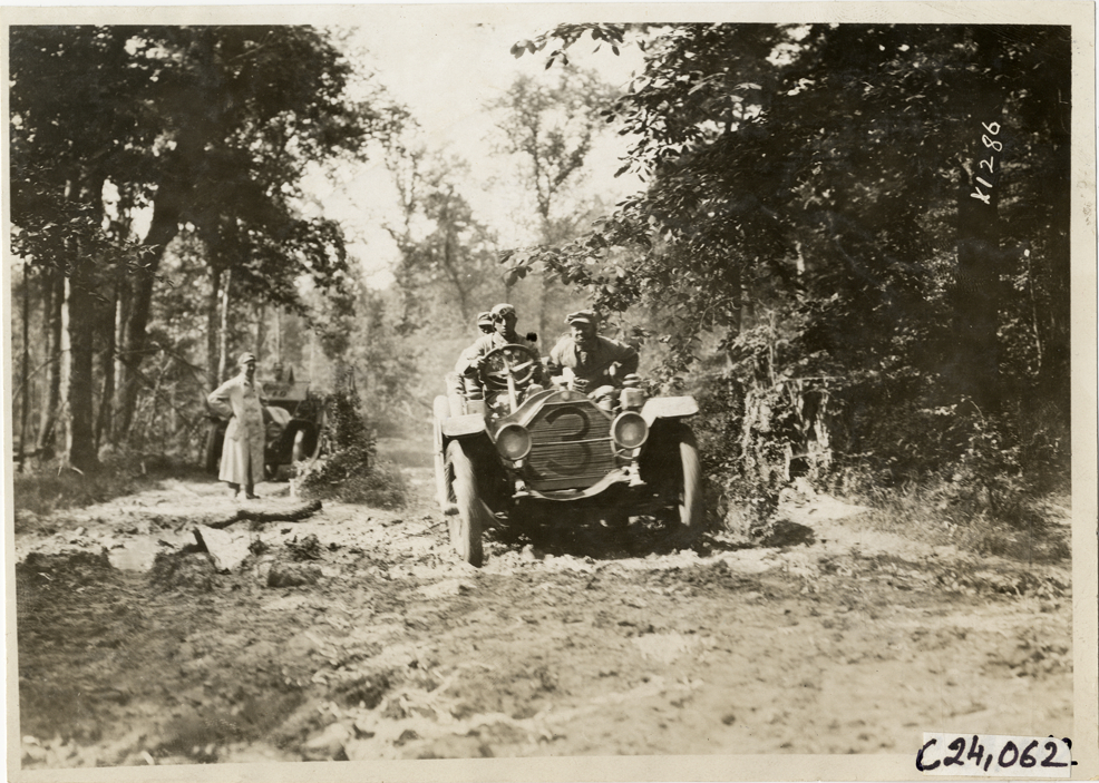 View of motorists in Chalmers car no. 3 traveling on forest road during the 1910 Glidden Tour. Stamped on back: "Spooner & Wells, Inc., photographers, telephone North 1745. 1231 Woodward Ave., Detroit, Mich. Detroit, 1231 Woodward, New York, 1931 Broadway." Handwritten on back: "Tours--Glidden Tour, 1910."