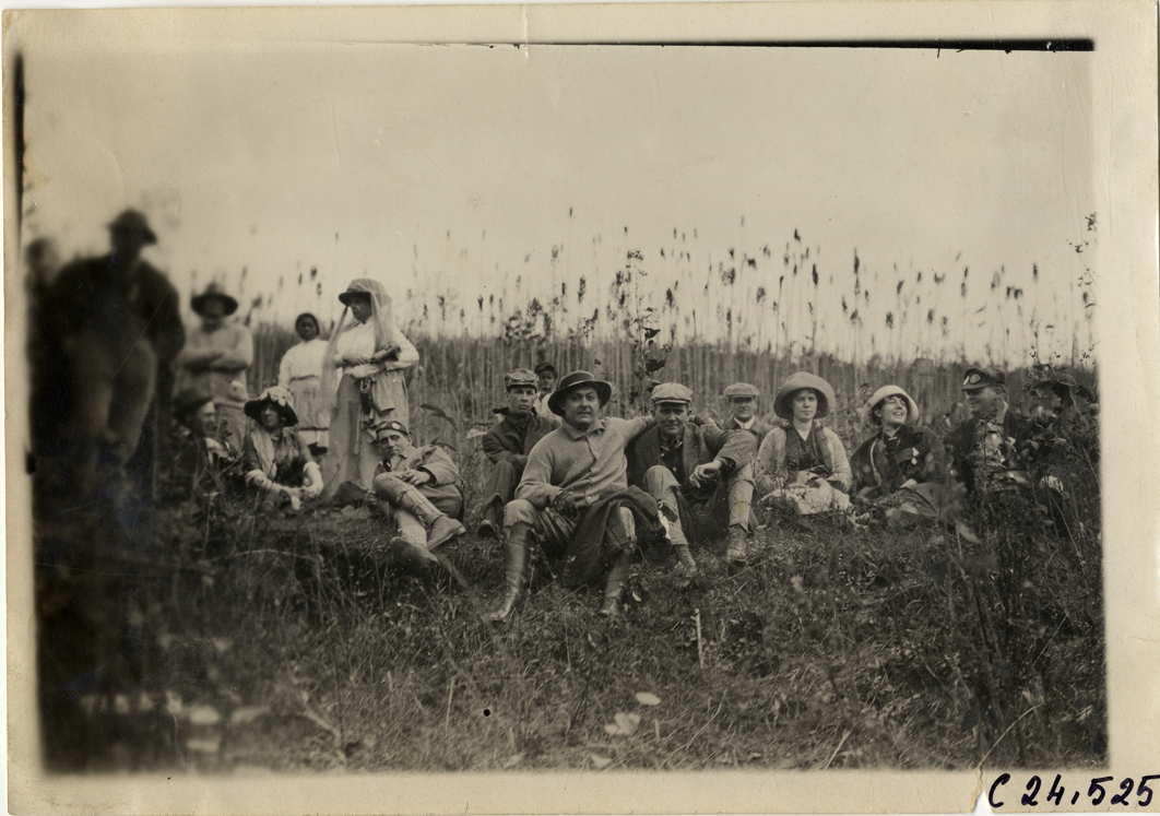 View of men and women on riverbank near Roanoke, Virginia during the 1911 Glidden Tour. Stamped on back: "Spooner & Wells, Inc., photographers, telephones 3472-3473 Columbus, 1931 Broadway, New York." Handwritten on back: "Tours--Glidden Tour, 1911."