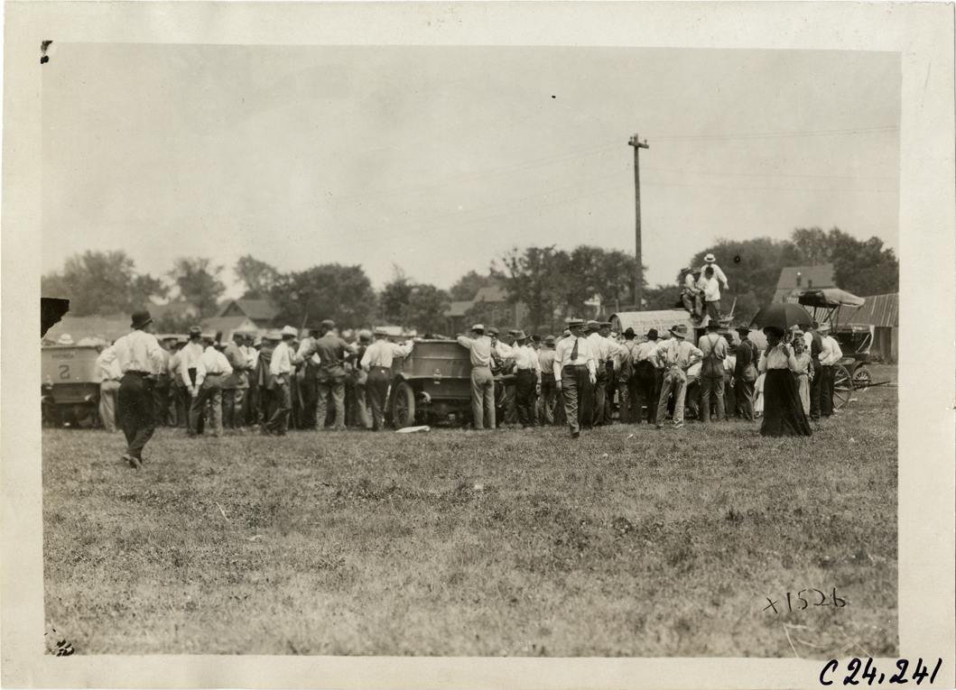 Distant view of spectators surrounding cars in field during the 1910 Glidden Tour. Stamped on back: "Spooner & Wells, Inc., photographers, telephone North 1745. 1231 Woodward Ave., Detroit, Mich. Detroit, 1231 Woodward, New York, 1931 Broadway." Handwritten on back: "Tours--Glidden Tour, 1910."