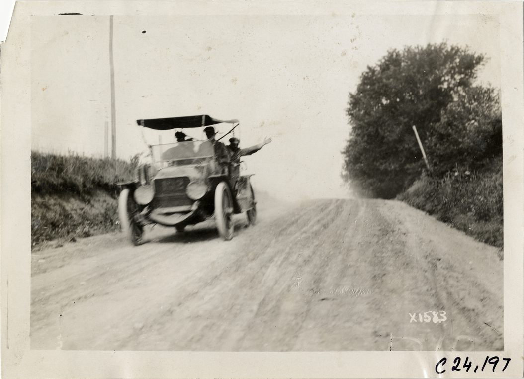View of motorists in Moline car no. 102 traveling on rural dirt road during the 1910 Glidden Tour. Stamped on back: "Spooner & Wells, Inc., photographers, telephone North 1745. 1231 Woodward Ave., Detroit, Mich. Detroit, 1231 Woodward, New York, 1931 Broadway." Handwritten on back: "Tours--Glidden Tour, 1910."