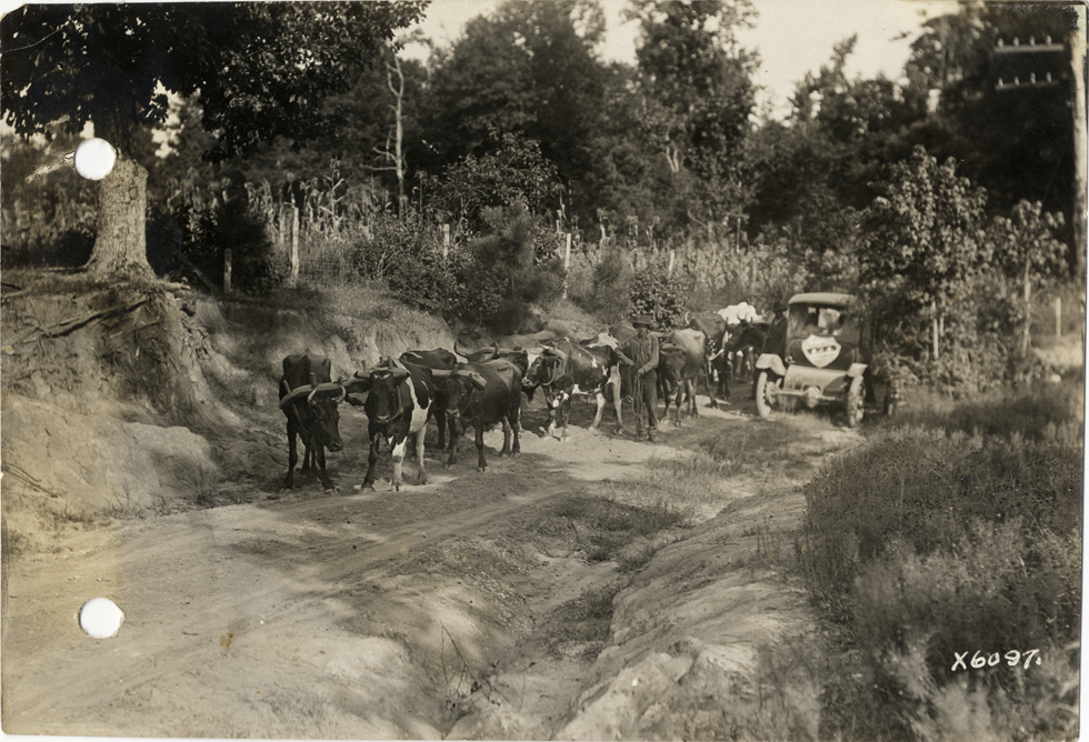 View of Flanders electric car passing man leading team of oxen on rural dirt road during the pathfinding expedition for the 1912 Glidden Tour. The pathfinding tour covered a route from Detroit, Michigan to New Orleans, Louisiana, but the 1912 Glidden Tour was canceled. Stamped on back: "Spooner & Wells, Inc., photographers, 1231 Woodward Ave., Detroit, Mich., telephone North 1745." Handwritten on back: "Pathfinder meeting oxen, 1912. Tours--Glidden Tour, 1912."
