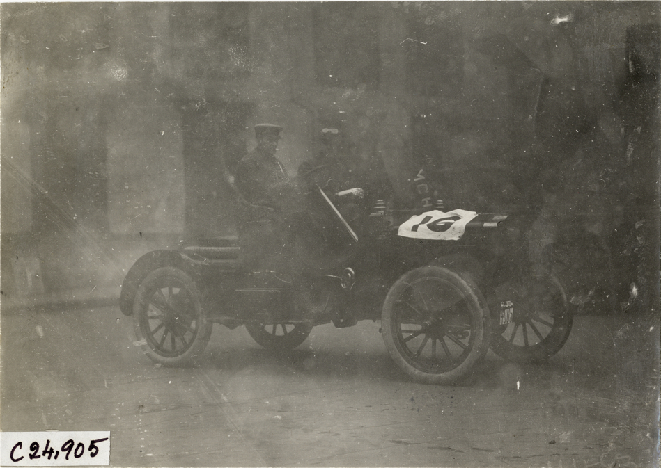 View of driver and passenger in Maxwell car no. 16 during the 1909 Harrisburg Endurance Run. Sponsored by the Motor Club of Harrisburg, Pennsylvania, the reliability contest covered routes through Maryland, Pennsylvania and Washington, D.C. Handwritten on back: "Tours--Harrisburg Endurance Run, 1909."