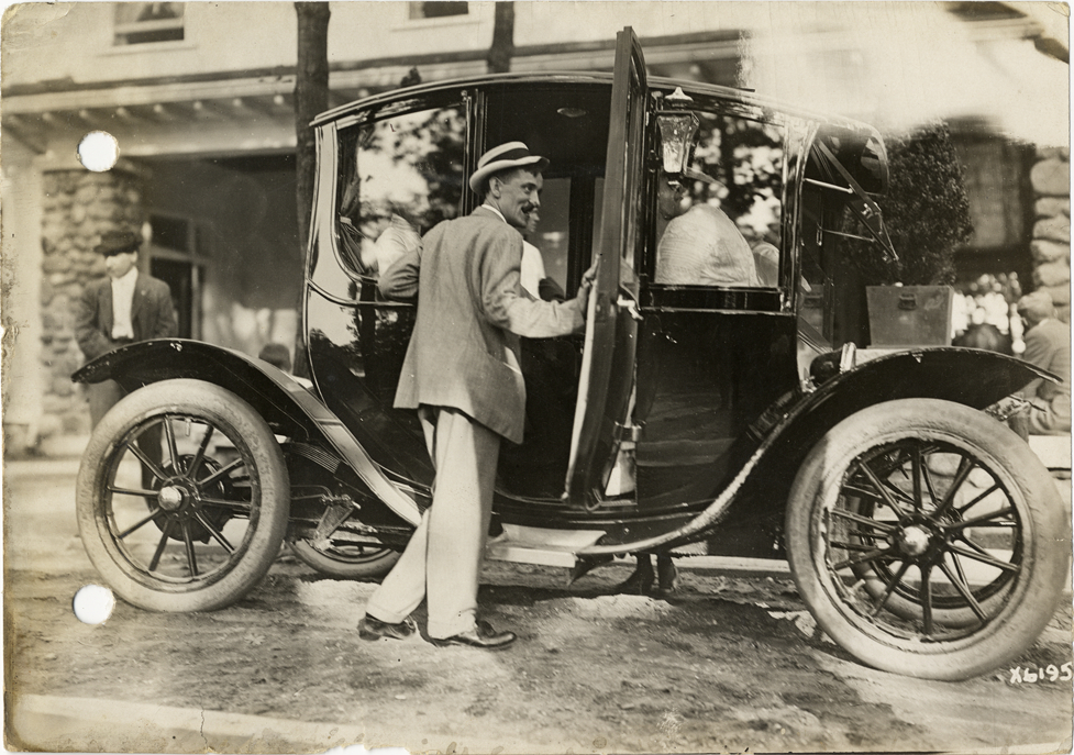 View of man posing with Flanders electric car at the farm of Walter E. Flanders, Orchard Lake, Michigan, during the pathfinding expedition for the 1912 Glidden Tour. The American Press Humorists were hosted at an event at the farm. The pathfinding tour covered a route from Detroit, Michigan to New Orleans, Louisiana, but the 1912 Glidden Tour was canceled. Handwritten on back: "Press humorists at Mr. Flanders farm, Sept., 1912. Tours--Glidden Tour, 1912."