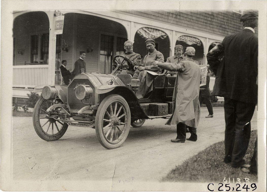View of motorists in Mitchell car on the grounds of the Chateau des Beaux Arts in Huntington, Long Island during the 1910 Montauk Point Reliability Run. Shingle style building in background. Sponsored by the Motor Contest Association, the two-day endurance run, also known as the "Montauk Light or Bust" reliability run, took place on Long Island. Stamped on back: "Spooner & Wells, Inc., photographers, telephones 3472-3473 Columbus, 1931 Broadway, New York." Handwritten on back: "Tours--Montauk Point Reliability Run, 1910."